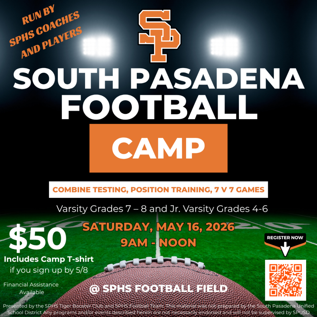 The SPHS Football Team is running a day camp on Saturday May 16th from 9-12 for kids in grades 4-8. Come have a fun morning with our winning football team!